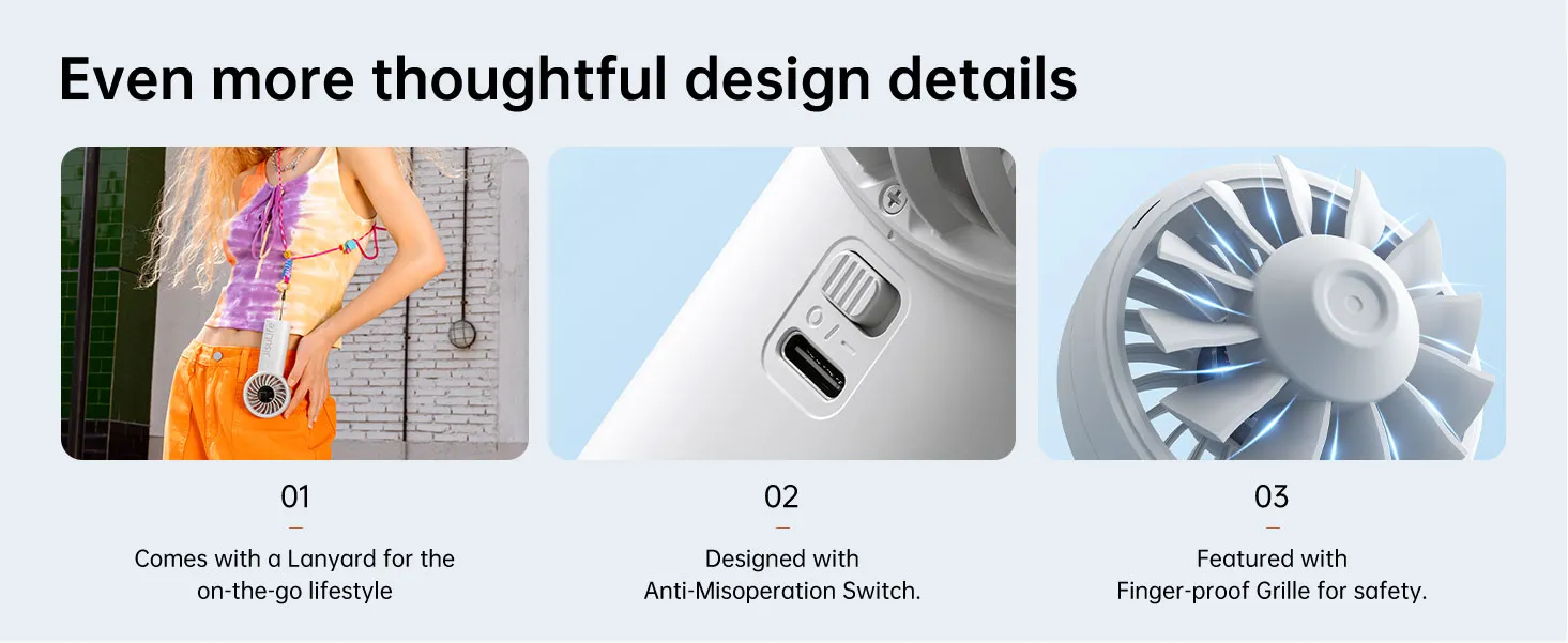 [Safe & Handy] Equipped with a hanging lanyard, anti-accidental-start switch, and finger-proof grilles.