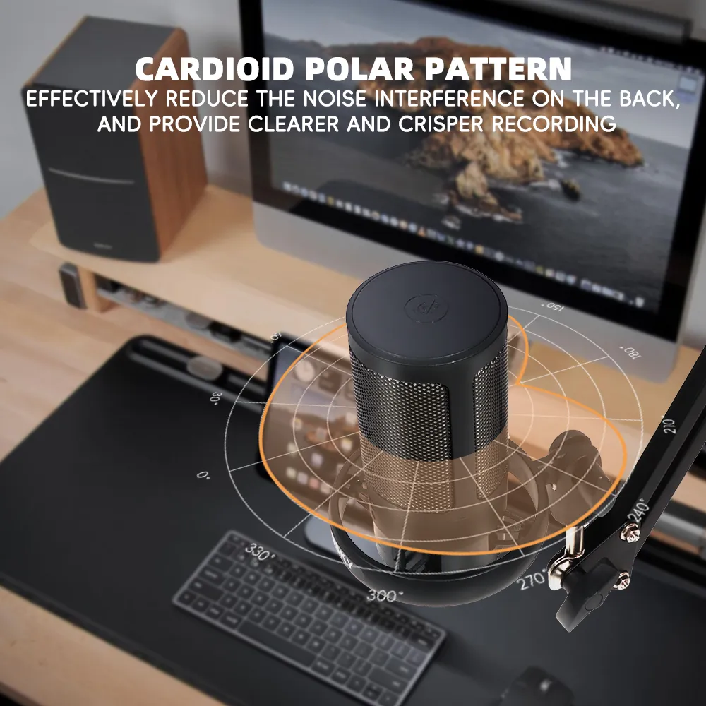 【Noise Reduction】PC gaming mic with external black metal pop filter and shock mount. All these accessories can help you filter out and soften the noise brought from plosives, breathing, rair or desktop vibration for more energetic sound.