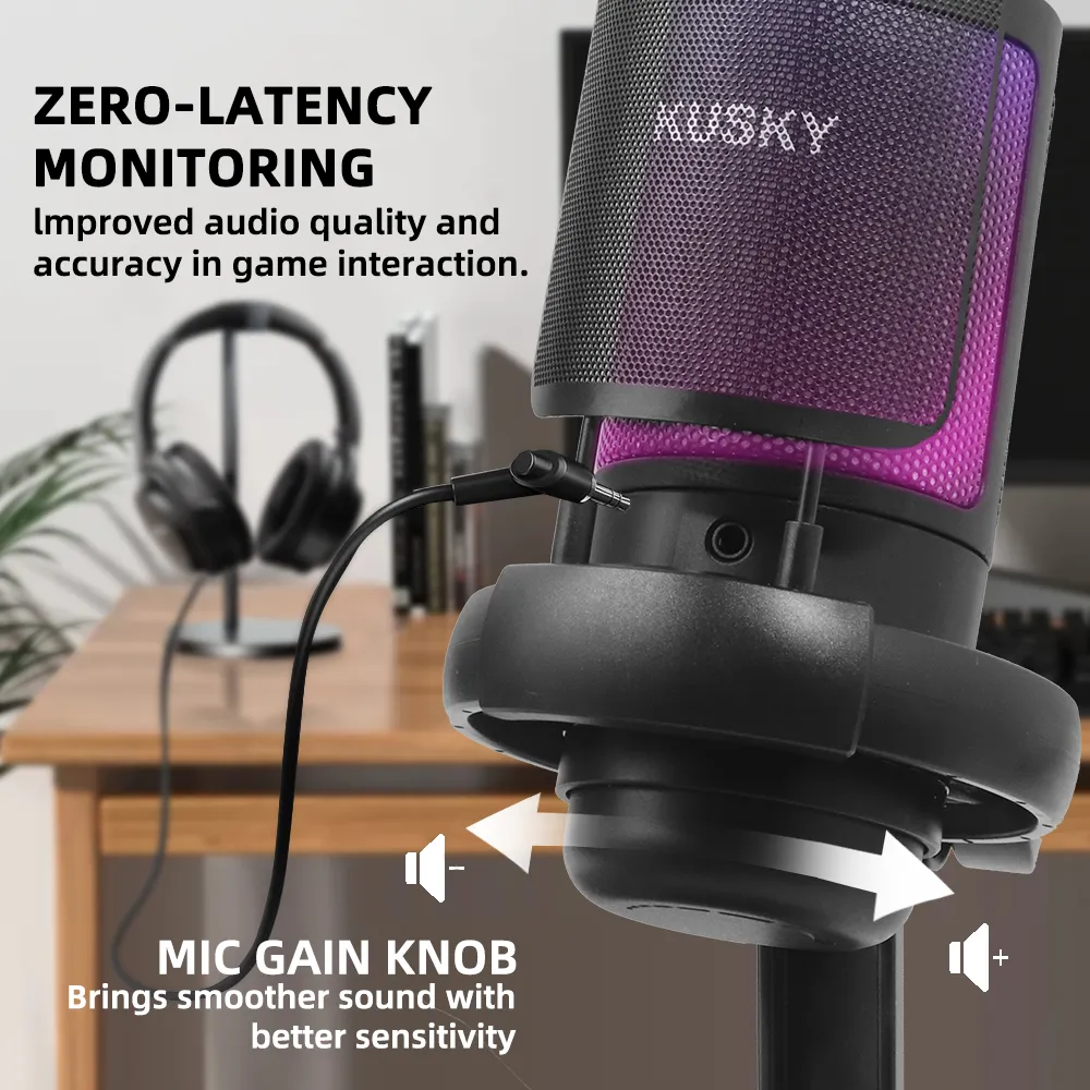 【Intuitive Mic Control】One-press mute functionality is very handy for users. The volume knobs on the base allows you to adjust the appropriate volume at will to record sound more comfortably. This gaming microphone's 3.5mm headphone output can provide direct, latency-free monitoring.